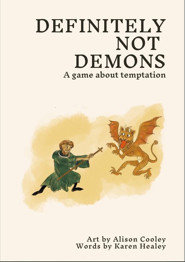 Fortunately, I had already collaborated with Alison Cooley on our two-person table-top role-playing game, Definitely Not Demons (you play a monk in a mysterious medieval monastery, or the demon attempting to tempt them to damnation).